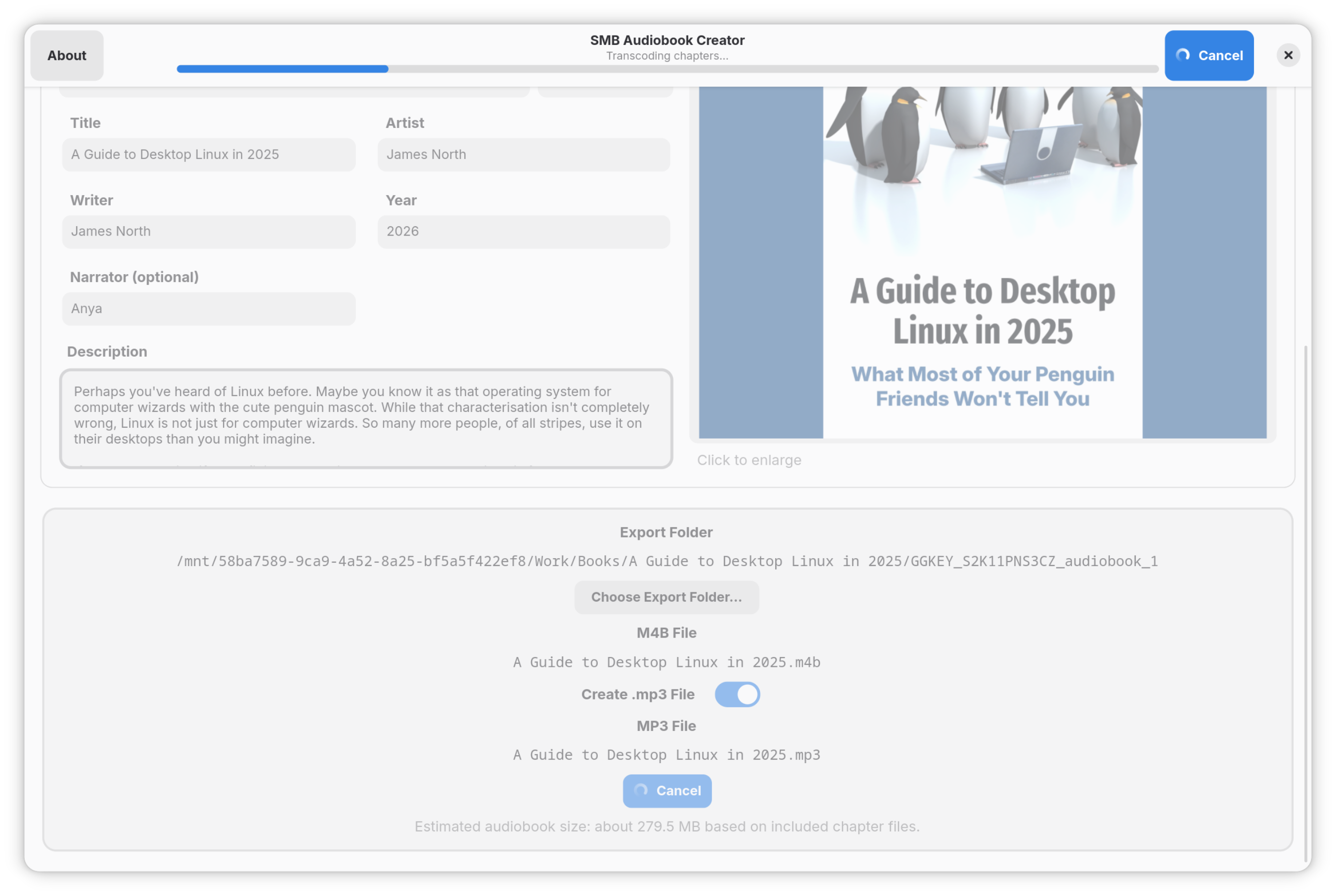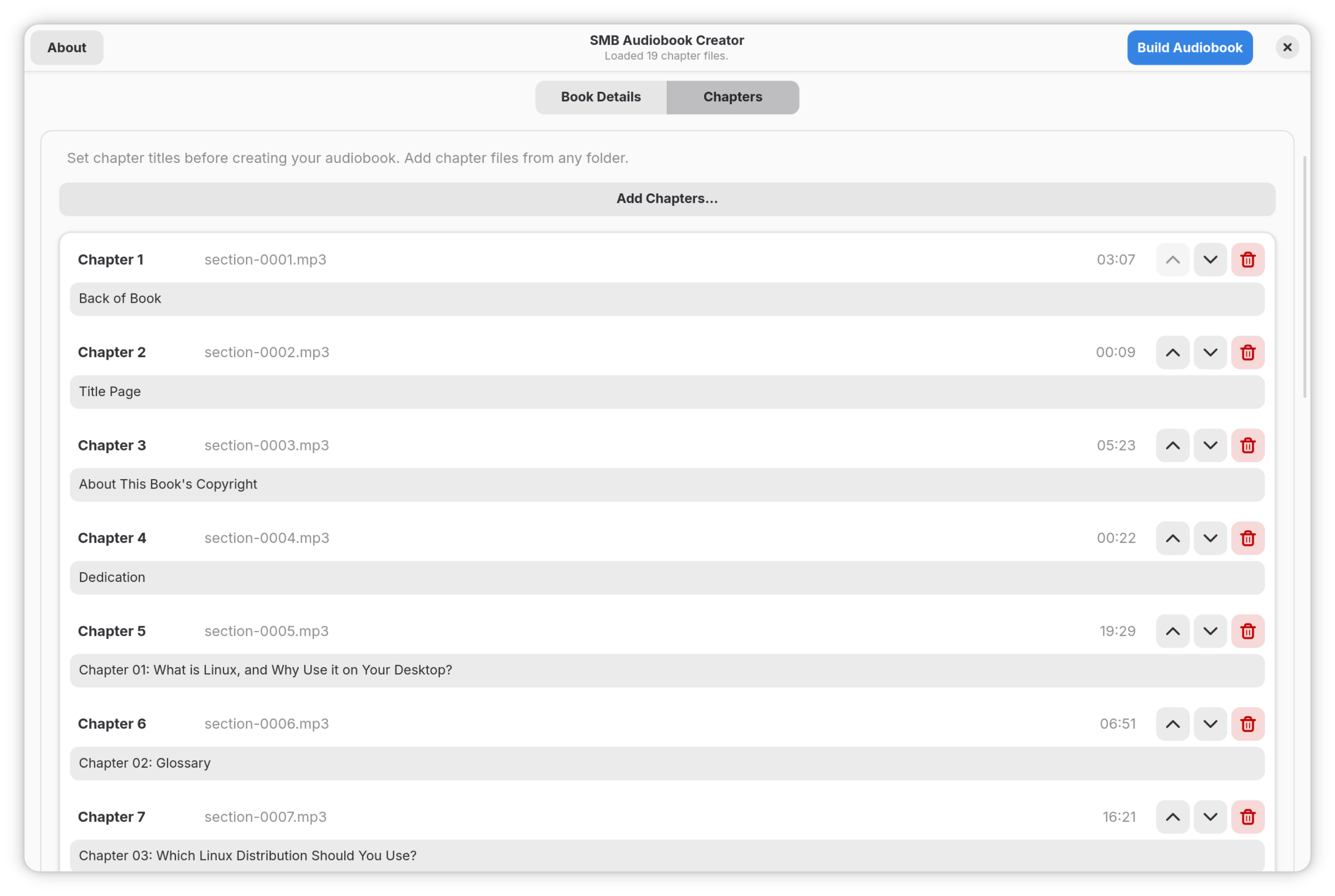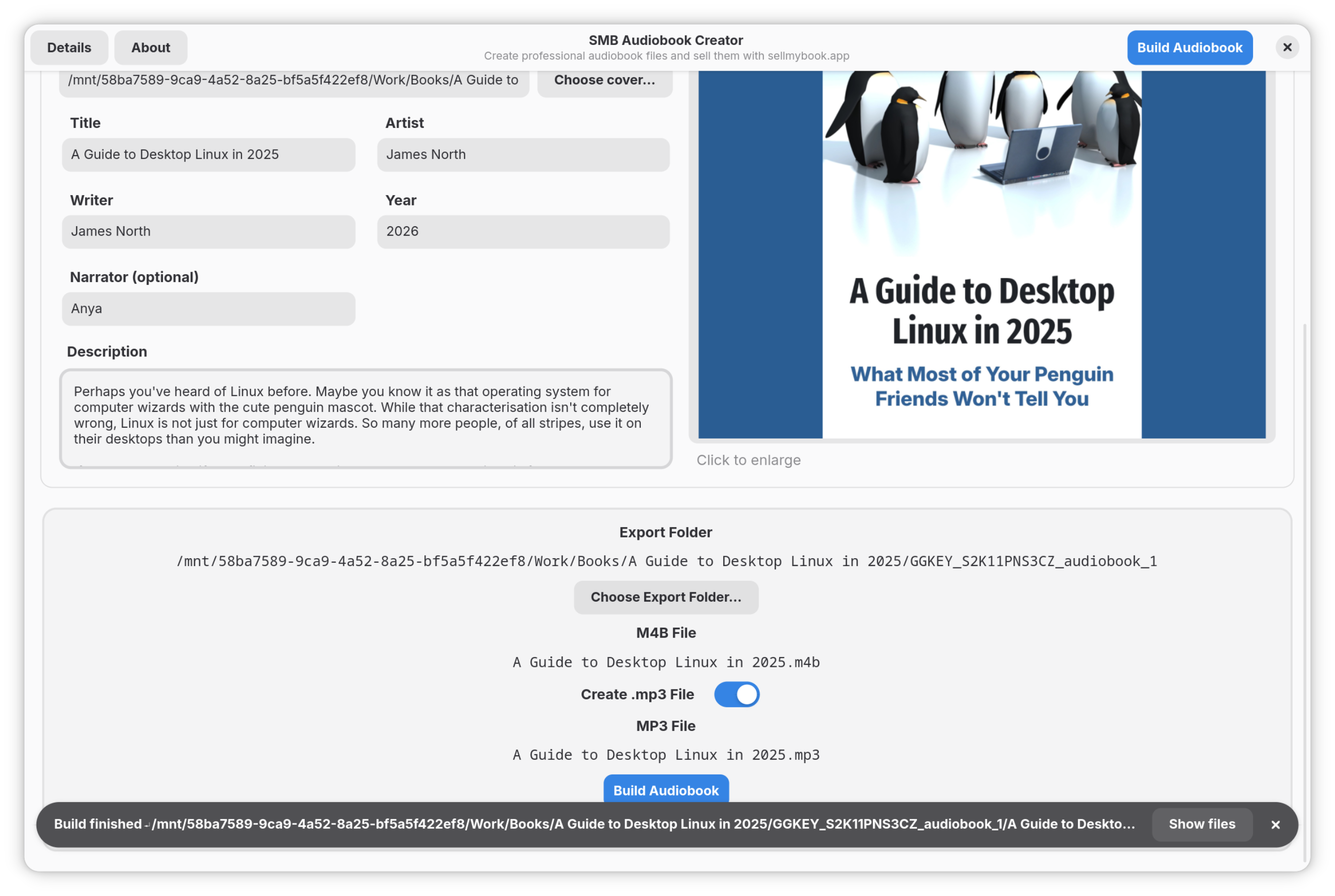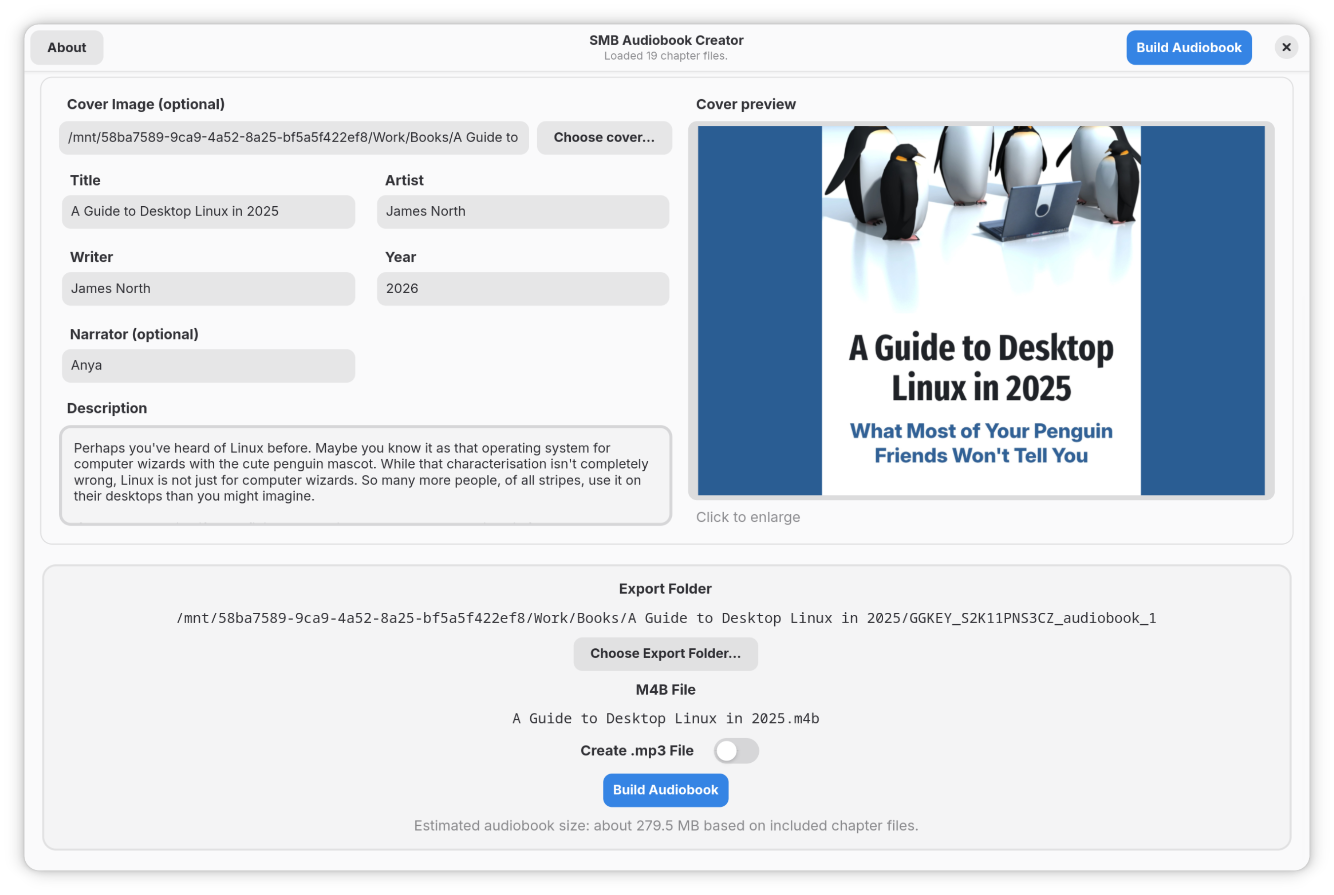 SMB Audiobook Creator is totally free, works on macOS, Linux, and Windows (with WSL), and it's open source. Plus it's super simple to use.